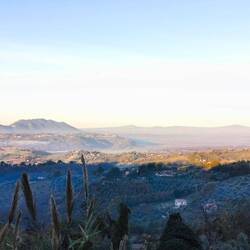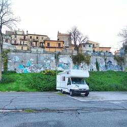 Right now, we're parked up at a really special spot in the small hill village of Montopoli di Sabina, just before Rome. We have a spectacular view over the wide valley from where we are!