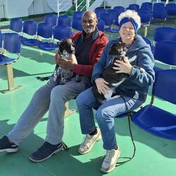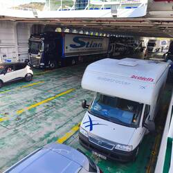 Time to head off to Villa San Giovanni for the ferry to Sicily! About an hour later, we arrive at the port only to learn that this specific ferry terminal is closed for 40 days 😳. What?! There were no signs anywhere along the road, and nothing online. Oh well, we decide, let's just drive 40 km further. The sun is shining, and we are relaxed 🎶. Another hour later, we're sitting on the sun deck with the dogs.