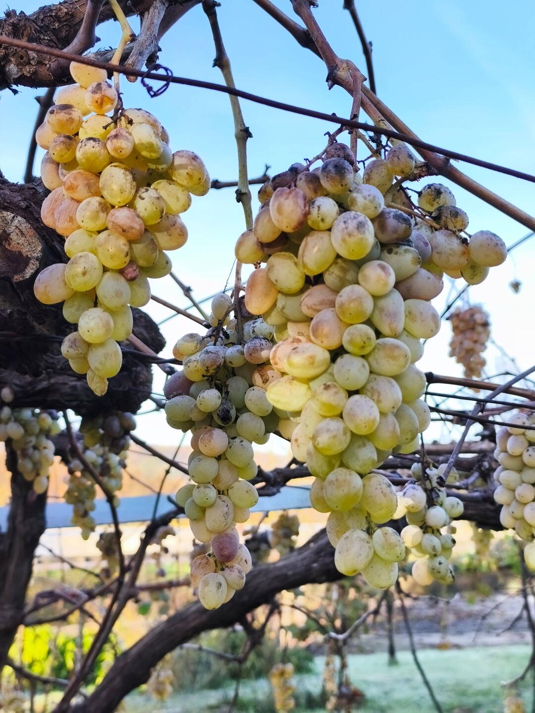 Around 8 AM, we're out with the dogs in a small park. It's still chilly and feels distinctly late-autumnal. We’re surprised to spot trellis laden with grapes and bare trees hanging with reddish fruit—apples? We get closer—nope, persimmons! We try the grapes; the green ones are delicious! We briefly wonder if anyone harvests them, contemplating whether we should sneak a few into our dog-poo bags... but we decide against it.