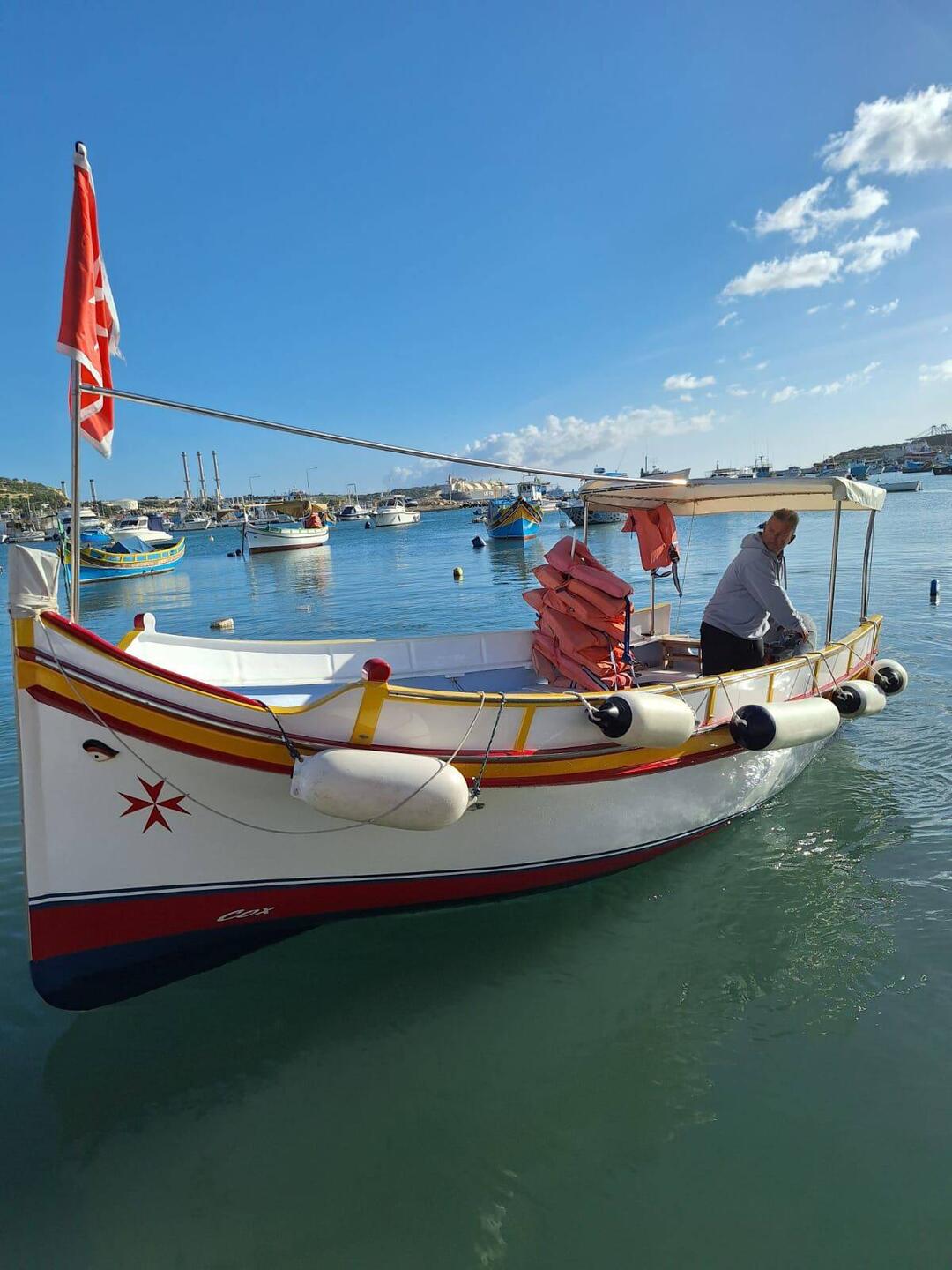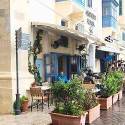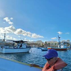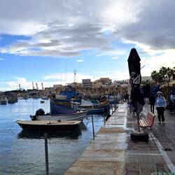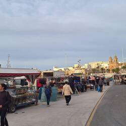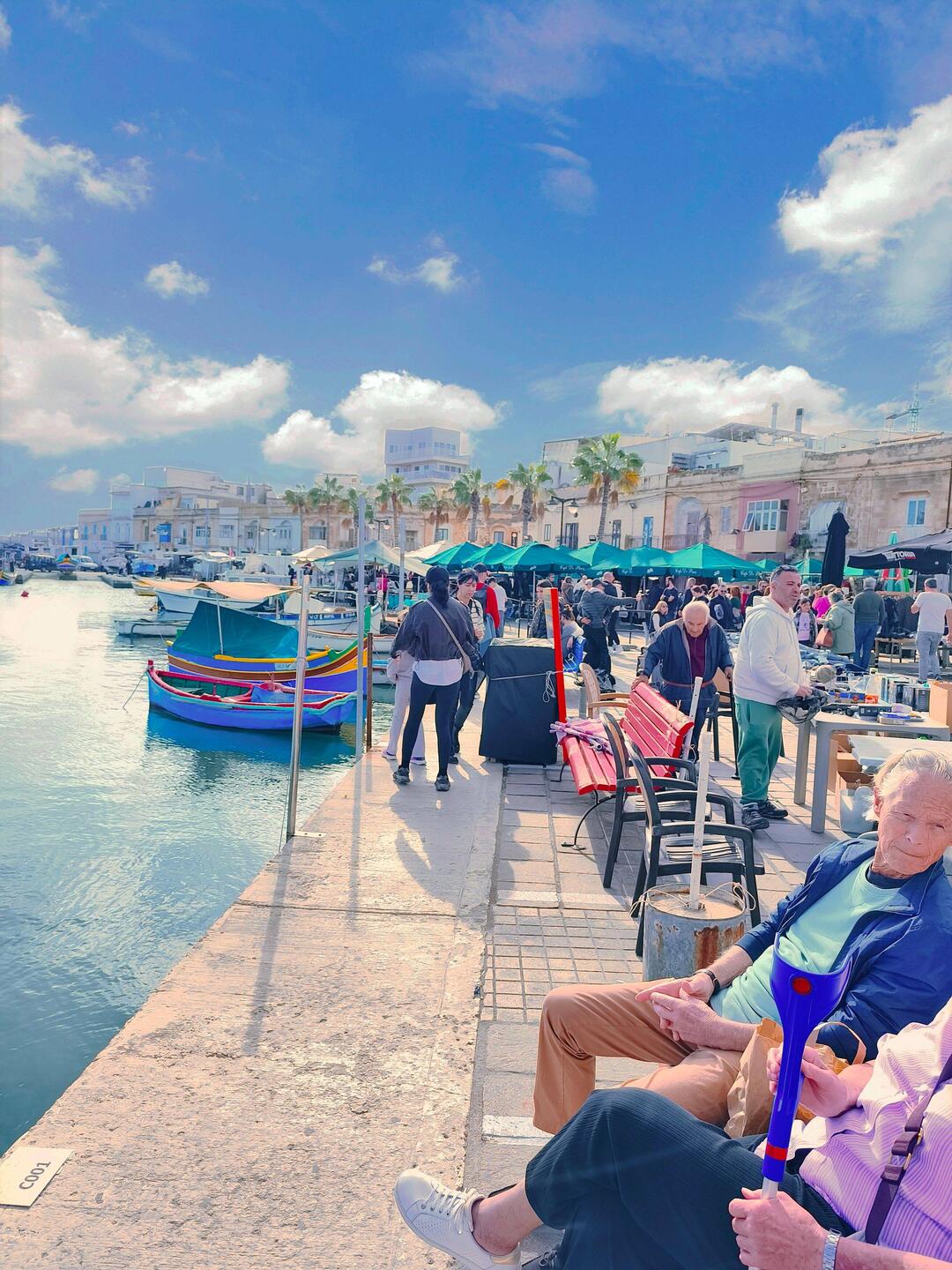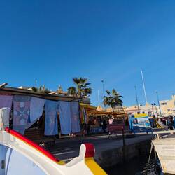 I won't go into too much detail, so I'll try to keep it brief. In any case, we totally get the enthusiasm now! This village is not a cheap fake like some Wild West sets. The massive, rustic wooden houses are wonderfully and harmoniously integrated into the steep slopes above a small cove. The buildings interiors roughly reflect the times of the 1930s, in which the film is based. You bump into an actor or two on the way, who are dressed as characters in the film. Cleverly integrated areas, some equipped with wooden swings and others comfy sunbeds on well-placed sun-decks, invite you to linger a while in the sun. We definitely could have skipped the Disney hoopla with the parade and dance show, but the visit to Santa Claus is quite nice and funny. Peppi and Cleo, as always and everywhere, draw attention and are a popular photo opportunity for many visitors. Everywhere we go, we find tables set up with classic board games like Tic-Tac-Toe or Ludo. We spend about two hours in the small village, which you could actually walk through in 5 minutes. It was supposed to be torn down after filming, but luckily, the residents of Mellieħa vehemently advocated for its preservation. For the night we drive back to Markaxlokk as the usual big open air Sunday market starts early the next morning and is spread all around the town harbour.