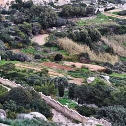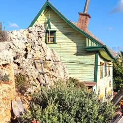 Am Tag zuvor habe ich im Netz eine begeisterte Erwähnung von "Popeye Village" gelesen, einem Dorf, das 1980 anlässlich der Dreharbeiten zum Film "Popey - der Seemann mit dem harten Schlag" (mit Robin Williams) errichtet wurde. Solche Attraktionen sind normalerweise nicht unbedingt was für Rupert und mich, aber die Aussage zweier junger Menschen (deren zweites Zuhause Malta ist), dies sei ihr Lieblingsplatz auf der Insel, hörte sich doch verlockend an. Also machten wir uns gegen Mittag auf den Weg nach Nord-Westen, der uns etwas eine halbe Stunde durch hügelige, mit Steinmauern eingefasste Gemüsegärten zur Anchor Bay nahe der Stadt Mellieħa führt.