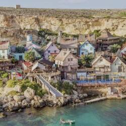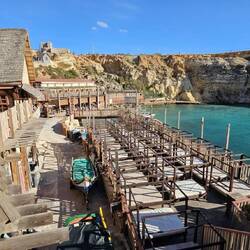 Yesterday I read a glowing online report about "Popeye Village," a filmset town,built in 1980 for the making "Popeye the sailor man" (starring Robin Williams). Attractions like this usually aren't quite Rupert’s and my thing, but the statement from two young people (who consider Malta their second home) that this was their favourite attraction on the island sounded really tempting. So, around noon, we head northwest. The drive takes us about half an hour through hilly vegetable gardens on both sides of the road enclosed by stone walls, leading us to Anchor Bay near the town of Mellieħa.