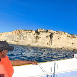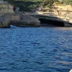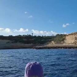 The wait pays off. We set off before the boat is fully occupied and have plenty of space for ourselves and the dogs. We leave the harbour, drive past an LNG terminal, and head out onto the open sea, always close to the steep coast. Peppi, as usual, hides under my seat, while Cleo would love to be the figurehead. The trip takes us past a lighthouse, St. Peter's Pool, a small bay including a cave for cliff jumpers and brave swimmers, and other spectacular rock formations. Larger ships passing us make the small boat rock quite a bit. After a good hour, we return to the harbour. That was fun!