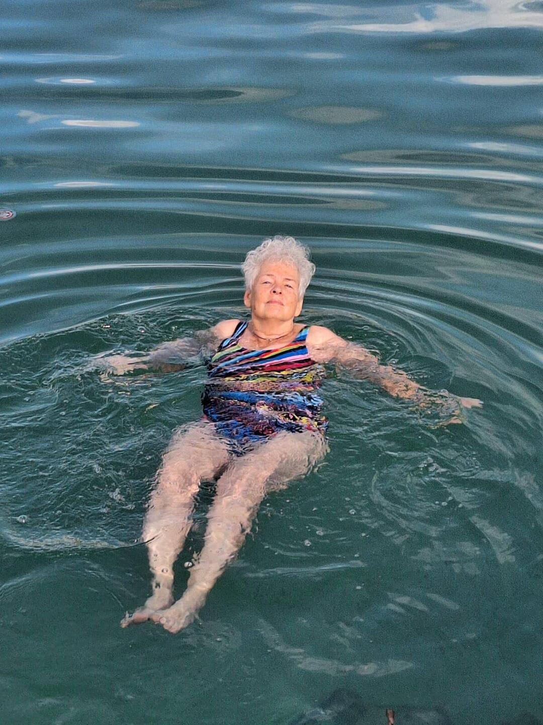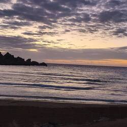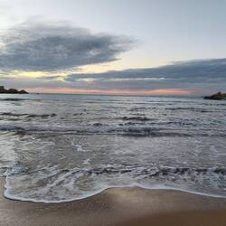 Heute Morgen nehmen die Hunde die Verfolgung eines dieser kleinen schwarzen Schreihälse auf. Ein Tohuwabohu aus Gebell, Gekrähe und fliegenden Federn geht ab, bis der Hahn beschließt, sich seinem Schicksal zu ergeben und Ruperts große Hände ihn gerade noch zu umschließen und aus dem Gefahrenbereich zu heben vermögen. Ab nach Hause mit dir! Nach der Heldentat widmet sich der Mann seinem Reise-Trampolin, und ich ziehe kurzentschlossen meinen Badeanzug an. Die Bucht hat einen winzigen Sandstrand, das Meer ist ruhig und die zunehmenden Wolken lassen noch Lücken für den Sonnenschein. In Erwartung des Kälteschocks kommen mir die sanften Wellen erstaunlich gnädig entgegen. Ich lasse mich eine Weile von ihnen tragen, schwimme ein Stück bis zu einer rostigen Eisentreppe bei Ruperts Trainingsplatz. Die Treppe ist so Öl-verschmiert, dass ich sie nicht anfassen mag. Mir wird klar, in was für einer Brühe ich mich hier tummle 🤢. Nix wie raus hier und im Auto unter die warme Dusche 🚿 🧼 Und in dem Moment kommt der Regen zurück 👋🏼