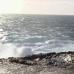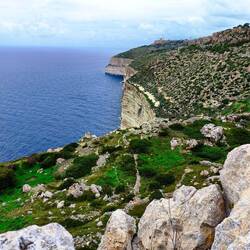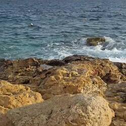 The beach here consists of mighty flat sandstone slabs interspersed with and surrounded by rugged, angular boulders. In between, there are fields of natural salt pans. Rupert catches up with us, and we walk, climb, and stumble across country, searching for the "Blue Hole," a small grotto where the waves mysteriously break and foam in a rhythmic pattern. We watch the thundering spectacle for a while and hurry back to the path before it gets dark shortly after 5 PM. We find a spot for the night by the railing of a small bay near Valletta Harbour. During the night, I hear roosters crowing very close by.