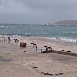 This Wednesday morning, I was woken by Peppi and Cleo barking at the sound of people talking outside. Soon after, we heard a bulldozer clearing the debris. On my morning walk, I saw that the destruction was horrendous. There was a gaping hole where steps once connected the promenade. Benches had been torn from their anchors, concrete flowerbeds were smashed and strewn about, and massive holes had been torn into the parking lot concrete. The volume of rocks washed up had doubled overnight.