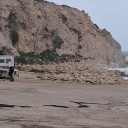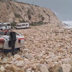 Und dann ist da noch Mildred: eine zierliche Frau aus Nigeria mit stylischen Klamotten – bevorzugt Leopardenmuster –, die in der Pflege arbeitet. Sie flüchtete rechtzeitig vor dem Sturm. Als ihr Auto weg war, kam dahinter ihr kleiner Gemüse- und Kräutergarten zum Vorschein. Auch Kolibri hatte sich beizeiten mit ihrem E-Bike zu Freunden aufgemacht. Nur der ‚Bonze‘ hielt furchtlos die Stellung. Die Wellenausläufer schwappten bis unter sein Fahrzeug, und als er seine ‚Arche‘ verließ, wurde ihm klar, dass mächtige Gesteinsbrocken über eine Distanz von etwa 25 Metern bis vor seine Tür gerollt waren. Er hat nun vier Wochen Zeit, sich um ein Räumfahrzeug zu bemühen, um eine Fahrspur freizulegen. Davon würden auch Kolibri und Mildred profitieren. Ein schöner Nebeneffekt: Die Monsterwellen haben einen kleinen, flachen Sandstrand geschaffen, wo vorher nur schwierige Steine im Wasser lagen.