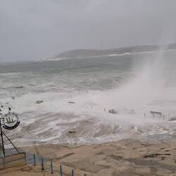 As I made my way back, a sea surge splashed many meters into the air off the promenade and caught me; it came in so fast there was simply no way to avoid it. We spent the rest of the day in our cozy camper as the storm peaked. By late evening, the sea reached our camper multiple times. It was too late to move; with rocks blocking our path and the gale-force winds howling, we were stuck.