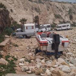 Dort in Hondoq haben wir auch Kolibri, Glenn, den ‚Bonzen‘ und Mildred kennengelernt. Glenn ist ein sympathischer Engländer, der am Wochenende von Malta rüberkommt und gerade eine Badewanne in sein merkwürdiges, uraltes Wohnmobil-Projekt einbaut. Direkt daneben hat ein Ostdeutscher sein Luxusmobil auf dicke Steine hochgebockt, als wolle er für immer bleiben. Ab und zu setzt er einen Helm auf und knattert mit seinem dicken Quad davon. Für uns ist er der ‚Bonze‘ geblieben, obwohl wir inzwischen seinen Vornamen kennen.