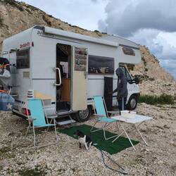 After the storm and our short nomadic stint, we’re enjoying some beautiful holiday days here in Hondoq. Every now and then, a quick supply run and then it's back "home." We’ve currently claimed Gerd's lucrative spot—complete with a palm tree behind the car, where I can soak up the sun on Charlie's second-hand lounger, tucked away from the prying eyes of tourists (once so far, at least).