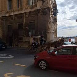Die Sonne macht sich heute rar und es ist windig. Ein guter Tag, die alte Hauptstadt Rabat und das angrenzende kleine Mdina zu besuchen. Die letzten vier Tage haben wir an der Nordost-Küste der Insel verbracht, und obwohl Rabat fast an der Südwest-Küste liegt, dauert die Fahrt nur 20 Minuten. Die Parksituation ist eine Herausforderung, und letztendlich landen wir auf einem kleinen Parkplatz mit einem Gefälle von um die 20%, und schlauerweise parken wir auch noch mit der Front bergab 😅 Rupert zieht mit all seiner Kraft die Handbremse an, sodass er sie später fast nicht mehr los bekommt. Er muss dazu aussteigen, und ich sitze schweißgebadet mit den Hunden in dem sich ruckartig nach vorne bewegenden Auto. Zum Glück ist das Lenkrad stark zur Bordsteinkante eingeschlagen, und ich habe vorsichtshalber einen dicken Stein vor einen Hinterreifen gelegt. Es geht gut aus. In Mdina lassen wir uns zu einer Kutschfahrt überreden, obwohl wir eigentlich ungefrühstückt hungrig sind. Der Kutscher verspricht uns eine Ausdehnung der 30minütigen Mdina-Tour auf Rabat zum selben Preis, was uns schließlich schwach macht. Die beiden Städte sind nur durch einen Parkplatz getrennt. Wir quetschen uns also mit den Hunden und unseren Rucksäcken in die kleine überdachte Kutschkabine, und das Gefährt trappelt mit uns durch die engen Gassen, in denen es von Touristen wimmelt. Nach 15 Minuten hält der Kutscher am Parkplatz vor Rabat an und erklärt die Fahrt für beendet. Wir protestieren und erinnern ihn an das Versprechen, uns auch Rabat zu zeigen. "Hier ist Rabat", sagt er, "dieser Parkplatz gehört zu Rabat". Das wollen wir uns nicht bieten lassen und weisen auf die kurze Dauer der Fahrt hin, und dass wir erwartet haben, etwas von Rabat zu sehen zu bekommen. Nach einem weiteren Versuch, sich zu rechtfertigen "dies ist nicht London, dies ist Rabat, oder?", den wir nicht akzeptieren, gibt er sich geschlagen und bringt uns ins Zentrum von Rabat, was ungefähr 10 Minuten dauert. Ich bedanke mich zum Abschied bei dem kleinen Pferd, und wir setzen uns zum Frühstücken in das nächste Straßencafé. Wie bei allen touristischen Highlights auf der Welt ist auch hier von der Ursprünglichkeit der über 3000 Jahre alten Stadt nicht mehr viel zu spüren. Und ich bin mir sehr wohl bewusst, dass wir als Touristen natürlich dazu beitragen, dass es so ist. Jedenfalls fühle ich mich hier nicht wohl, und außerdem ist es hier oben auf dem Berg ungemütlich draußen. Wir laufen noch ein wenig durch die Stadt, besuchen keine der Attraktionen, wie z.b die Katakomben, und kehren bald zum Auto zurück (siehe oben!) Der nächstgelegene Übernachtungsplatz ist der uns schon bekannte Parkplatz mit den garagenartigen Wochenend-Apartments vom 5./6. Dezember in Qawra.