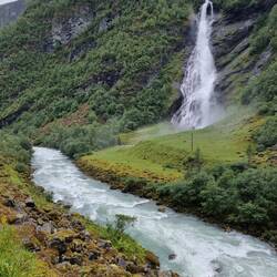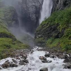 Zum Schluss der Tour ging es dann für mich alleine noch zum Vettisfossen, dem höchsten frei fallenden Wasserfall Norwegens, mit 275 m Fallhöhe. Ich war erst unten und dann oben auf einer Plattform.Okumaya devam et