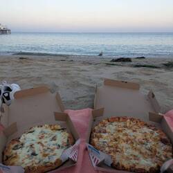Pizza essen im Sonnenuntergang. Leider habe wir auf dem Weg zurück von Malibu nach Santa Monica auch viele verbrannte Häuser gesehen