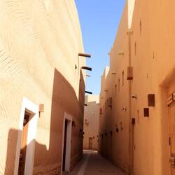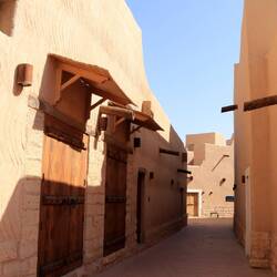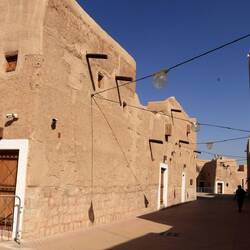 Der Al Masmak Palace liegt am Rand der Altstadt. Diese ist mittlerweile komplett restauriert. Man findet keine vom Regen zerstörten Lehmhäuser mehr. Es sind schöne Gassen, die teilweise von Sonnensegeln überspannt sind. Die meisten von ihnen sind noch abgesperrt. Das gesamte Viertel ist noch nicht eröffnet. Keine Ahnung, ob sich in Zukunft hinter jeder Tür ein Geschäft verbergen soll. Das wäre dann ein riesiges Shoppingareal. Ob dieses dann touristisch sein wird? Ich habe auf der gesamten Reise keine einzige Postkarte entdeckt. Es besteht bis jetzt keine Gefahr, in einen Einkaufsrausch zu verfallen und das Gewicht für den Koffer zu sprengen. Wir natürlich schon mit unseren 12 kg Datteln. Aber wer außer uns hat schon 12kg Datteln geschenkt bekommen? Außerdem können wir noch weitere 46kg Datteln transportieren, da jeder von uns 2x23kg Freigepäck hat.
