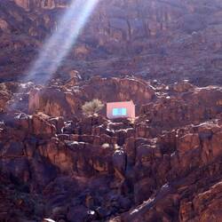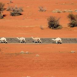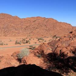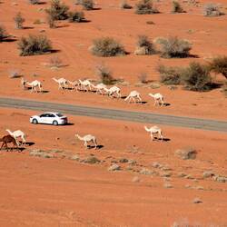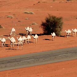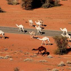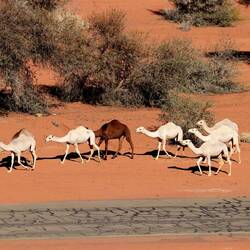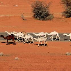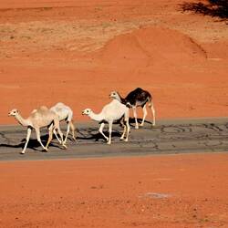 Weiter geht es durch die rotbraune Landschaft. In der Ferne erheben sich die Vulkanberge. Nach einiger Zeit erreichen wir den Abzweig zum Al Hitaymah Krater. Die Piste sieht gut aus. Das müsste mit meinem Auto machbar sein. Los geht es. Zunächst fester Gravel, dann heftiges Wellblech und schließlich Sand. Der wird immer tiefer und ausgefahrenen. Mir wird heiß. Es kommen Senken. Kann ich noch zurück? Dann wird es wieder fester und ich will schon aufatmen, als es noch viel schlechter wird. Das Auto schwimmt. Das geht nicht. Ich schaffe das nicht. Ich halte, drehe vorsichtig im Sand, um mich ja nicht festzufahren. Zurück. Doch auf dem Rückweg sieht manches, was auf dem Hinweg nicht so schlimm aussah, viel schlimmer aus. Mir wird wieder heiß. Was einmal ging, muss auch ein zweites Mal gehen. Und ja. Wir kommen wieder auf festen Grund. Schade, aber das geht mit diesem Auto wirklich nicht. Nächstes Mal muss ein 4x4 her. Wir fahren noch ein Stück in die Berge und ich entdecke einen großen Greifvogel. Dann fotografiere ich eben den, statt des Vulkankraters. Ein Auto hält neben mir. Ob ich einen Kaffee möchte und nach Ha‘il fahre. Nein, ich will weder Kaffee noch fahren wir nach Ha‘il. Da kommen wir her. Der Saudi fährt weiter und wir auch. Er wartet aber auf uns und zeigt uns ein toll auf den Berg gebautes Haus. Ein Cafe. Er will uns hinauffahren. Wir sollen die Aussicht genießen. Nun gut, warum nicht? Sein Auto kämpft sich durch die Felsen. Teilweise geht es blanken Fels hinauf und hinunter. Wer baut so ein Café? Doch sein 4x4 kämpft sich nach oben und schafft die Strecke mit Bravur. Wir erreichen unser Ziel. Die Aussicht ist spektakulär zumal unten eine große Herde Kamele durch den Sand läuft. Sie umkreisen mein Auto. Es sieht toll aus. So viele. Das Café ist nicht besetzt. Aber der Ausblick ist wunderschön. Plötzlich ist Moritz Besitzer einer Uhr und einer Sonnenbrillle. Hm. Außerdem werden wir gefragt, ob wir Hilfe brauchen, ein Hotel, sonstiges. Nein, alles bestens. Dann komme ich auf die Idee und frage, ob ich mit meinem Auto den Al Hitaymah Krater erreichen kann. Nein - niemals. Aber er bringt uns gerne hin. Wenn er wüsste, dass wir fast schon dort waren. Mit meinem Auto.