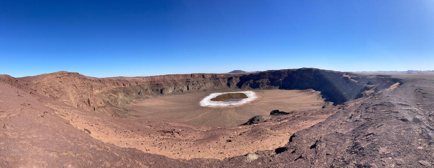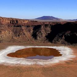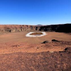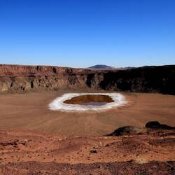Weiter geht es und schon biegen wir auf die Kraterpiste ab. Aus Jeepperspektive sieht die Piste noch viel schlimmer aus. Gott, wie konnte ich da überhaupt fahren? Aber irgendwie ging es ja offensichtlich. Er saust durch den Sand, wir fliegen über das Wellblech und spüren es kaum. Tiefsand, Steine - kein Problem. Nach fünf Minuten sind wir unterhalb des Kraterrands. Ich will aussteigen und hochsteigen. Kommt nicht in Frage. Ein Saudi läuft nicht. Das Auto kämpft sich kurz die Felsen hoch. Geschafft. Und der Ausblick? Ohne Worte. Wahnsinn, spektakulär, atemberaubend, grandios…… Wir blicken in den Krater. Unten steht Wasser. Die Kraterwände spiegeln sich. Die Wasserstelle ist von einer weißen Salzschicht umgeben. Im Hintergrund, in der Mulde des Kraterrandes, thront in der Ferne der nächste Vulkan. Und mal wieder: wir sind geflasht. Wir genießen diesen wundervollen Ort und fahren dann wieder zurück. Nicht auf der zerfurchten Piste, sondern daneben. Und dieses daneben ist wunderbar. Das hätte ich mit meinem Auto auch geschafft. Ich muss lernen weniger in Wegen und Pisten, sondern mehr in Richtungen zu denken. Eigentlich kenne ich das doch schon aus der Mongolei. Kurz bevor wir die Straße erreichen, werden wir noch auf einen Kaffee eingeladen. Wir können nicht ablehnen, obwohl es schon spät ist. Es folgt wieder ein Telefonat und als wir ankommen - ja wo eigentlich, ist der Kaffee schon fertig. Wir sind uns nicht sicher, ob es das Privathaus eines Bekannten ist. Wir werden begrüßt. Ich bin zurückhaltend. Aber ich erhalte von allen einen Handschlag im Gegensatz zu manch deutscher Politikerin. Mit Kaffee, Tee und Datteln werden wir bewirtet. Es werden viele Fotos gemacht und mit Google Übersetzer klappt auch die Kommunikation halbwegs. Wir sind eingeladen wieder zukommen. Gleich drei Übernachtungsmöglichkeiten stehen uns zur Verfügung.