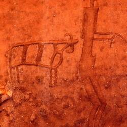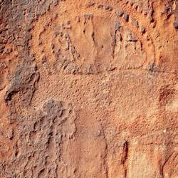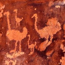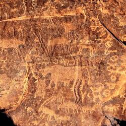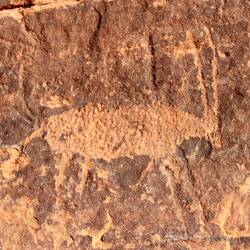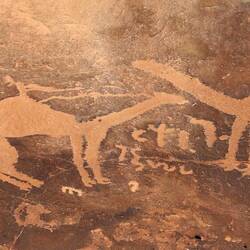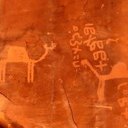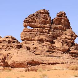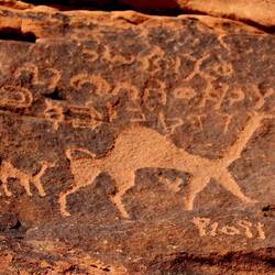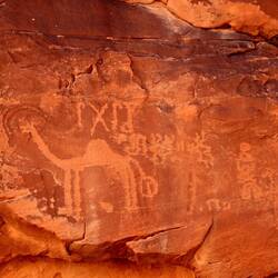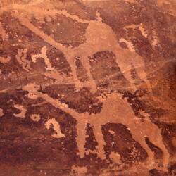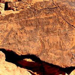 Eine der umfangreichsten Fundstellen findet man in der Oasenstadt Jubbah. Hier erstreckt sich die Wüste Nefud, ein schier endloses, trockenes Gebiet aus Sand und Geröll. Und mitten drin ragt der Fels Jabal Umm Sanman aus dem Sand. Er ist überzogen mit Petroglyphen.