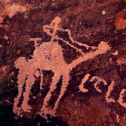 Es finden sich hier vor allen Dingen Abbildungen verschiedener Tiere. Aber auch frühe Formen der arabischen Schrift durchziehen große Flächen des Geländes. Vereinzelt gibt es sogar Abbildungen in menschlicher Form. Wir entdecken den König an einer Felswand, dann einen Jäger, der die Tiere mit einem Boomerang erlegt und einen weiteren Jäger, der mit Pfeil und Bogen auf der Jagd ist. Diese drei Figuren sind lebensgroß und unheimlich beeindruckend, noch nie habe ich so schöne Darstellungen gesehen.