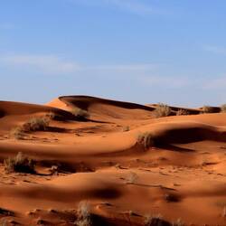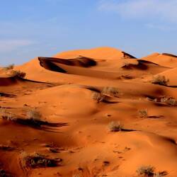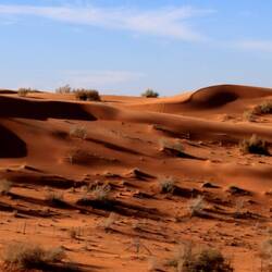 Einige Kilometer liegen mal wieder vor uns. Wir fahren durch die tiefrote Wüste. Düne reiht sich an Düne. Nicht spektakulär, aber schön. Alle Dünen sind mit grün grauem Gesträuch bewachsen. Das perfekte Futter für Kamele. Wir fahren im Rhythmus der Dünen bergauf und bergab, während der Hochgeschwindigkeitszug eine gerade Trasse erhalten hat. Für ihn wurden alle Dünentäler aufgefüllt. Für US zum Glück nicht, sonst wäre die Fahrt doch sehr eintönig. Gegen Mittag tauchen in dem weiten Fit plötzlich 4 Berge auf. Die einzigen in der gesamten Umgebung. Sie sind unser Ziel und definitiv nicht zu übersehen.