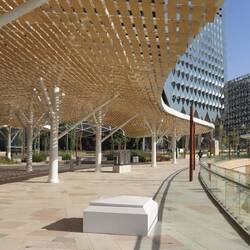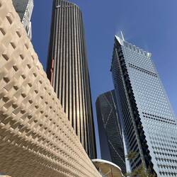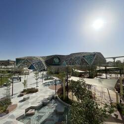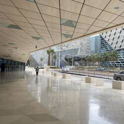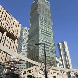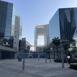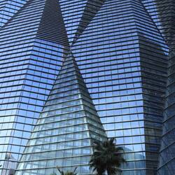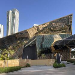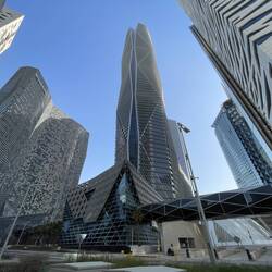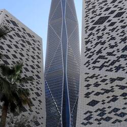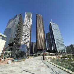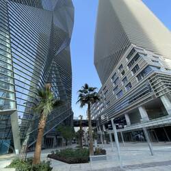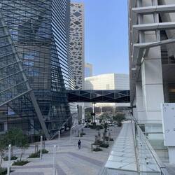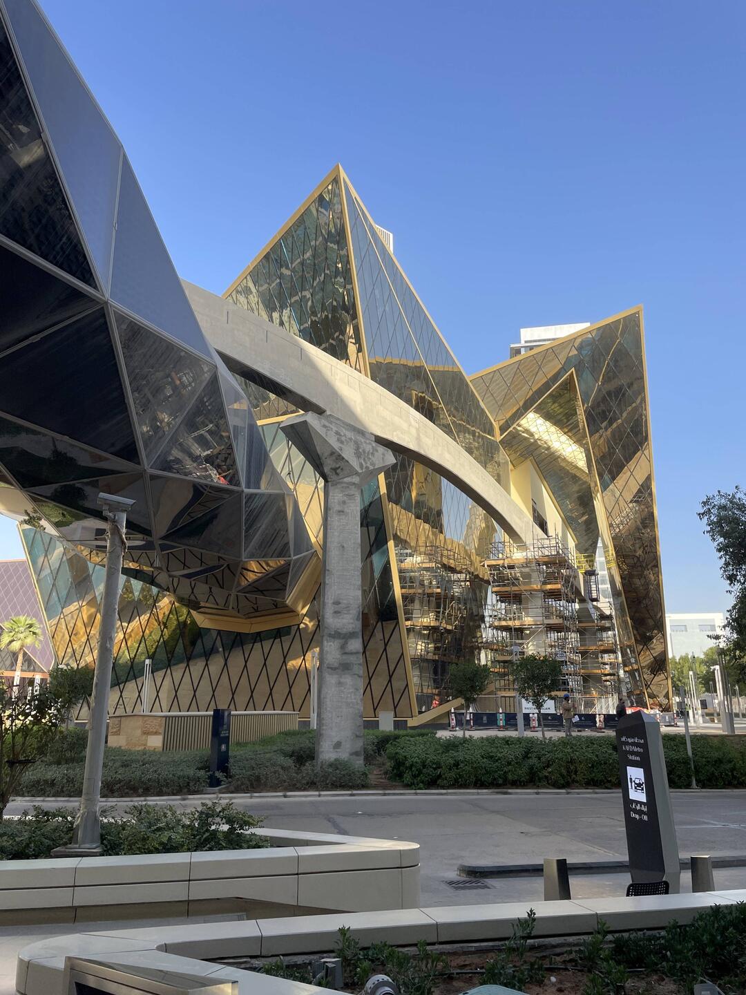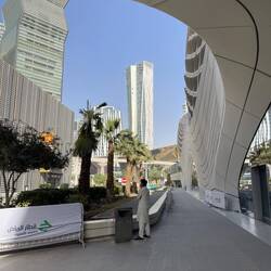 Nachdem wir von Zaha Hadids Metrostationen schon restlose begeistert sind, betreten wir den Financial District. Hier reiht sich ein architektonisches Hochhauswunder an das nächste. Höher, schöner eleganter, graziler, ausgefallener, grandioser…. Welche Adjektive soll ich verwenden. Man findet geometrische Formen in unterschiedlichster Art und Farbe. Das Material der Fassaden ist teils schlicht naturfarben, dann spiegelnd, asymmetrisch angeordnet. So entdeckt man in der Fassade des einen Hauses schon das nächste unterbrochen von einem Park mit Palmen und Oliven. Grandios geschwungene Brücken verbinden Gebäude und Wege. Um diese zu verkürzen wird noch eine Monorail gebaut, die sich in luftiger Höhe gleich einer Achterbahn ohne Loopings um die Gebäude windet. Schade, dass sie sich noch im Bau befindet. Einige Bereiche sind daher noch abgesperrt. Auch einige Moscheen und jede Menge Restaurants und Geschäfte finden sich hier. Da Saudis gerne Essen und Shoppen wird auf die Work Life Balance geachtet.