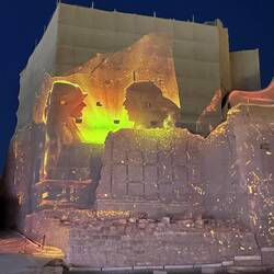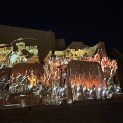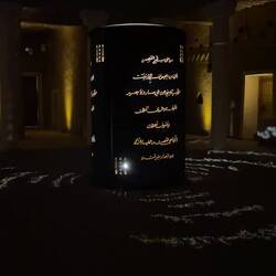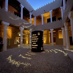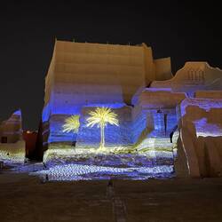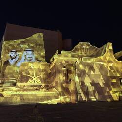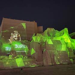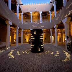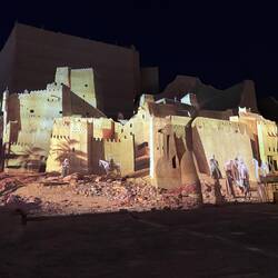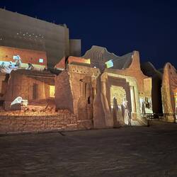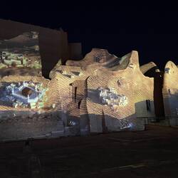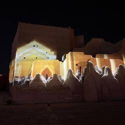 Als wir die Anlage fast verlassen haben, beginnt genau hier eine Lichtshow. Die Geschichte Saudi-Arabiens wird an die Wände dieses wunderschönen Gebäudes projiziert. Wie ich schon öfter geschrieben habe: hier hat alles Stil, ist alles elegant, wunderschön gemacht und durchdacht. So auch diese Lichtshow. Sie zieht mich in ihren Bann und begeistert mich für das Land. Es ist mal wieder grandios, wie alles gestaltet wurde.