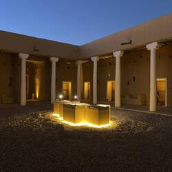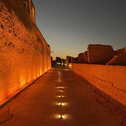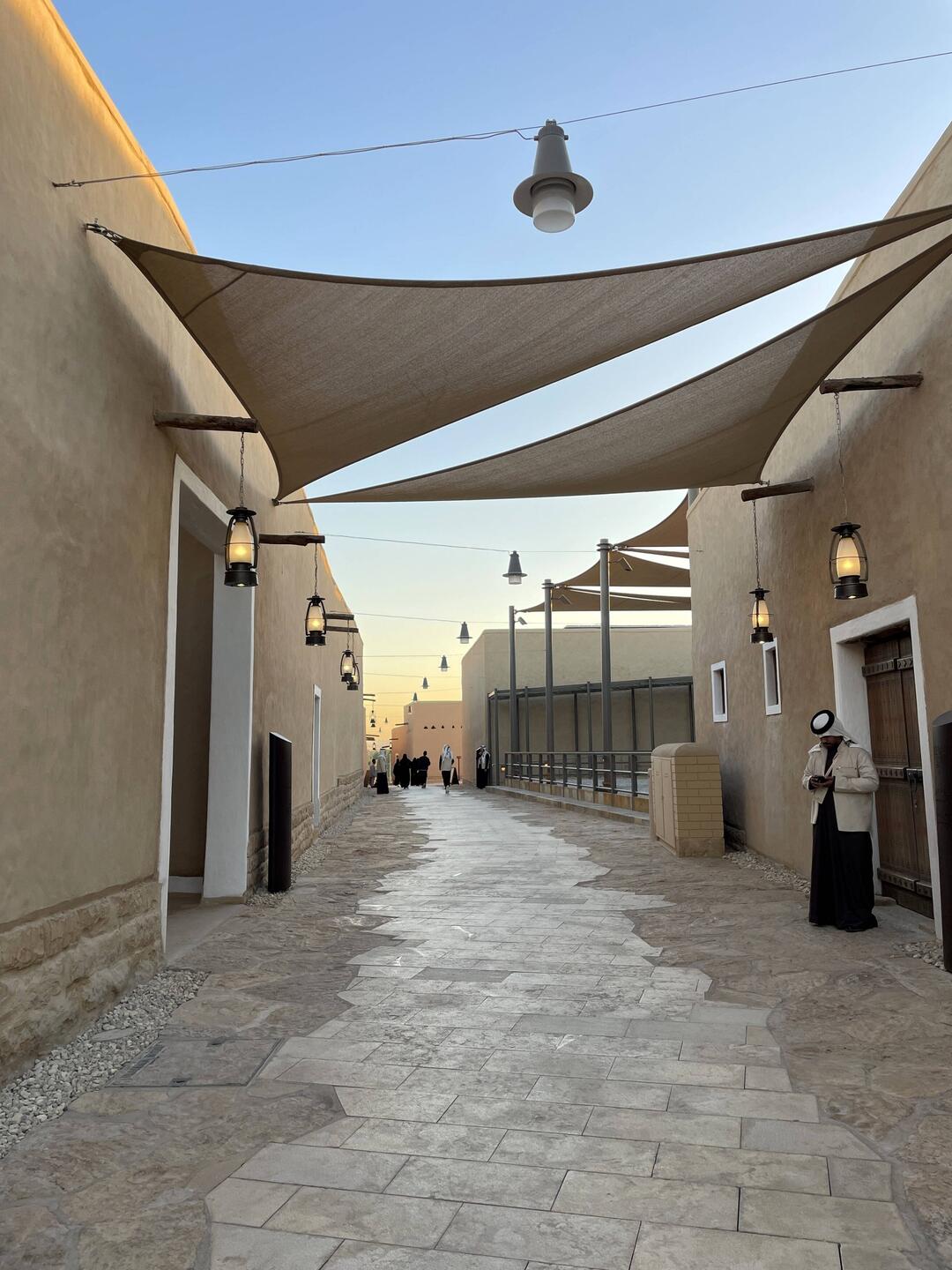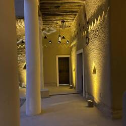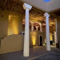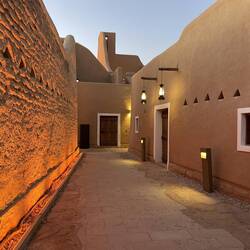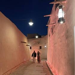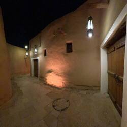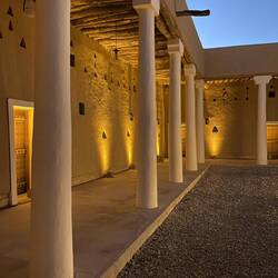 Gegen 16:30 Uhr kehren wir nochmals nach At-Turaif zurück. Wir lassen uns viel Zeit, da wir auf den Sonnenuntergang, die Dämmerung und auf die Lichter in den Gassen warten. Es dauert und so sehen wir uns einige der Galerien noch einmal an. Doch dann ist es soweit. Die Gassen erstrahlen im warmen Licht der Laternen. Das ist eine sehr schöne Stimmung. Plötzlich ist es hier voll. Erst am Nachmittag kommen die Besucher. Wir genießen die Ausblicke und entdecken, dass die beiden schönen Paläste, die uns bisher verwehrt waren, geöffnet sind. Wir betreten einen schönen Innenhof. Er ist von einer Säulenreihe umgeben. Das Dach ist offen. Ein sehr schönes Gebäude. Moritz will noch ein Foto machen. Das ist dann auch mit dem Handy nicht mehr erlaubt. Man versteht es einfach nicht.