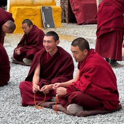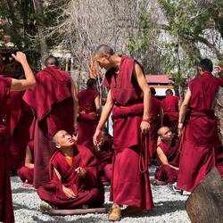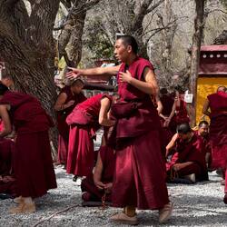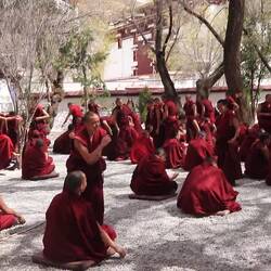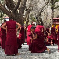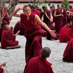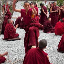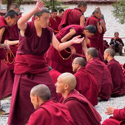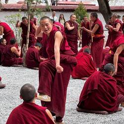 Auf Matten sitzen und stehen Mönche mit roten Gewändern in Dreiergruppen zusammen. In jeder Gruppe stellt der stehende Mönch Fragen über den erlernten Unterrichtsstoff. Mit ihren Antworten analysieren die Sitzenden das Gelernte kritisch. Es geht laut zu. Manchmal erscheinen die Diskutierenden freundlich. Dann aber scheint es ernsthaft Streit zu geben und die Diskussion nimmt Fahrt auf. Es ist interessant die Emotionen in den Angesichtern abzulesen. Ein tolles Spektakel, das wir so noch nie erlebt haben.