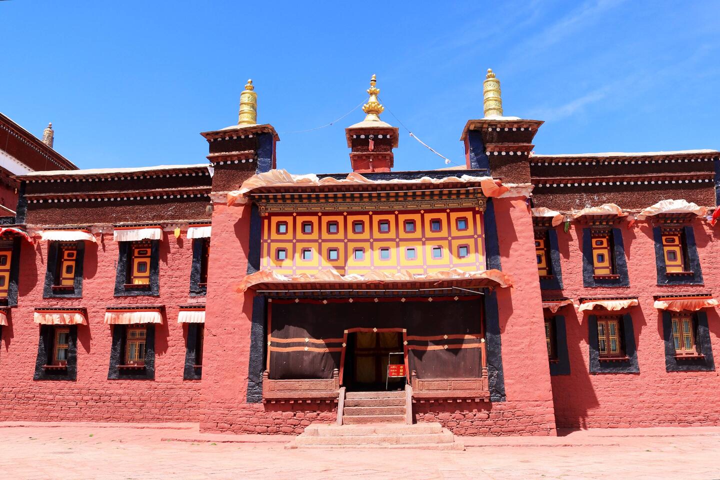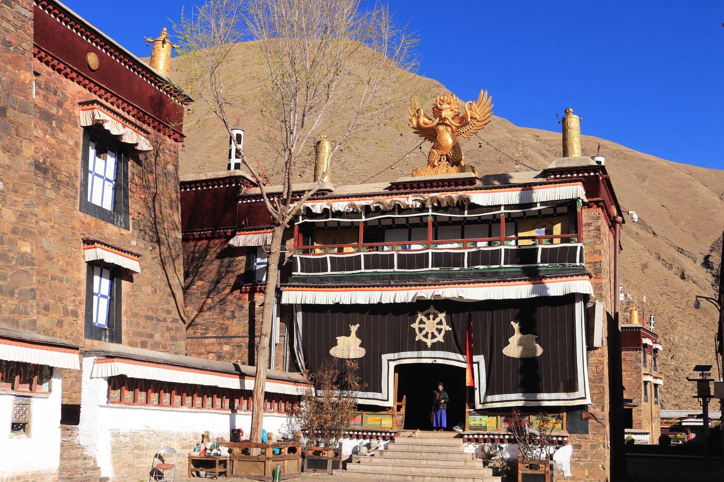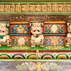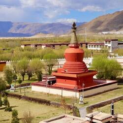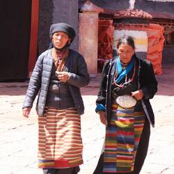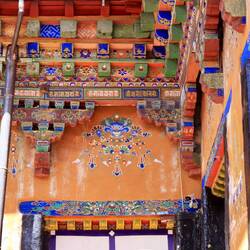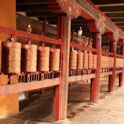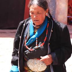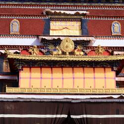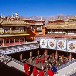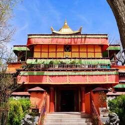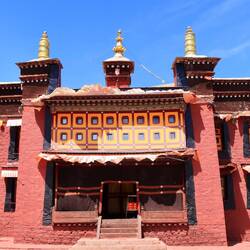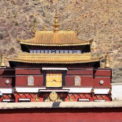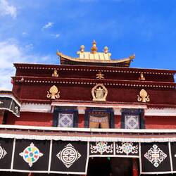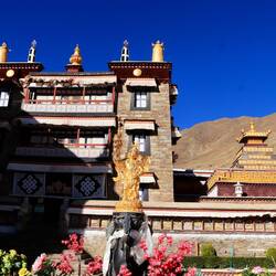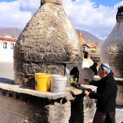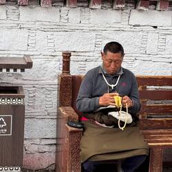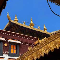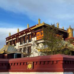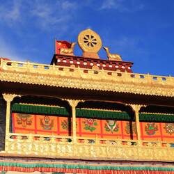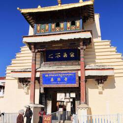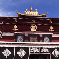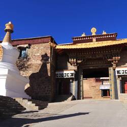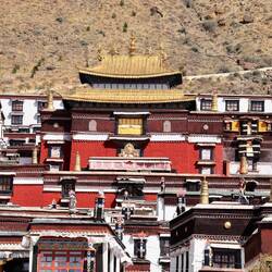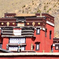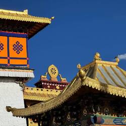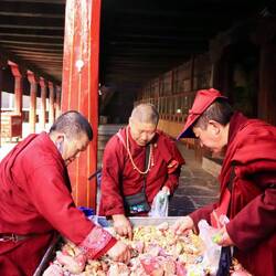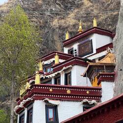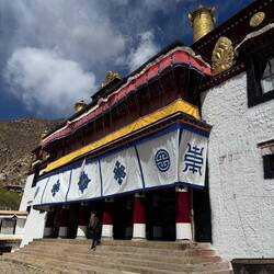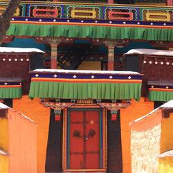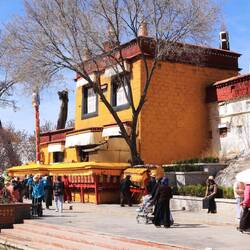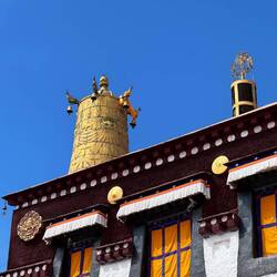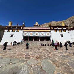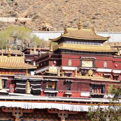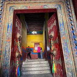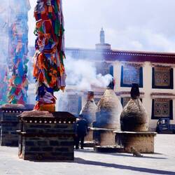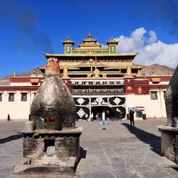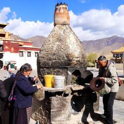 Es sind sehr viele Gläubige unterwegs, die das Kooster umrunden, die Gebetsmühlen drehen und sich teilweise auch betend auf den Boden werfen. Vor dem Kloster stehe. Die großen weißen Öfen, in denen Wacholder und Weihrauch verbrannt werden. Der Duft verteilt sich im gesamten Areal. Im Kloster selbst wird flüssige Butter in die Kerzenbehälter geschüttet und gebetet. Viele Gläubige opfern die weißen tibetischen Schals oder bringen Mandalas als Opfer dar. Dabei schütteln man Körner mehrmals auf eine Kupferschale und reibt mit der Hand darüber. Da die Körner immer anders darüber rollen, spricht man von einem Mandala. Der Geruch der Butterkerzen vermischt mit Wacholder und Weihreich ist betörend. An alle wichtigen Figuren wird Geld gelegt. In einem anderen Tempel findet das abgebet der Mönche statt. Dazu wird musiziert. Die Trommel wird geschlagen, in sehr tiefe Hörner und trompetenartige Instrumente geblasen. Das ein Horn solch tiefe, durchdringende Töne erzeugen kann, ist unglaublich. Derganze Körper vibriert. Dazu der Geruch von Weihrauch und Butterfett. Diese Atmosphäre ist unglaublich. Aber irgendwann muss ich weg. Es wird mir zu viel. Die lauten, tiefen Töne wirken gegen meinen inneren Rhythmus. Ein sehr intensives Erlebnis. Wir umrunden die Anlage und entdecken immer wieder wunderschöne Tempel und Kapellen. Ein wundervoller Ort.Read more