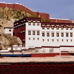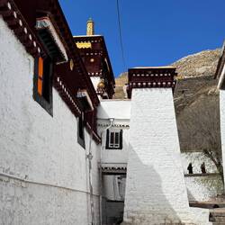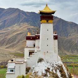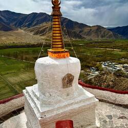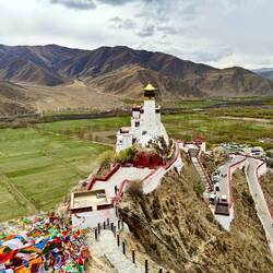 Die Yumbu Lakang Festung ist die älteste und somit erste Festung Tibets. Sie thront über einem fruchtbaren Tal in der Nähe des Brahmaputra Flusses. Heute ist es keine Festung mehr sondern ein weiterer Tempel. Leider macht uns das Wetter komplett einen Strich durch die Rechnung. Aber auch im Grauen ist der Anblick phänomenal. Wir umrunden die Festung und besteigen den dahinterliegenden Berg. Von oben bietet sich ein Traumblick auf das Tal, die Festung und die schneebedeckten Berge. Und der Wind bläst. Als Wind kann man ihn kaum noch bezeichnen, eher ein Sturm. Die Gebetsfahnen flattern im Wind. Bogenartig überspannen sie das Tal. Je nachdem, in welche Richtung man blickt, legen sie sich wie ein Bilderrahmen und die Berge. Ein wunderschöner Farbklecks in dem heutigen Grau. Und dann passiert ist. Der Wind ist zu stark und reißt eine Befestigung aus der Verankerung. Es tut einen Schlag und mit einem Mal sind alle Gebetsfahnen abgerissen. Einige wirbeln abgerissen in wildem Tanz durch die Luft und verschwinden im Tal. Die Bänder liegen auf dem Boden. Alles ist zerstört. Wie schade. Es sah so wunderschön aus. Auf de, Weg zurück zur Festung müssen wir unter einen Regenrinne hindurch. Wenn der Ansturm falsch bläst, wird man komplett geduscht. Wie sollte es auch anders sein. Als ich mich entscheide loszulaufen, fließt das Wasser wunderbar wo es hin soll. Als ich genau darüber Tür stehe, dreht der Wind und ich werde komplett geduscht. Auch als ich schon unten durch bin und die Stufen hinuntereile, trifft mich das Wasser immer wieder. Somit bin ich sauber geduscht, klatschnass. Darauf hätte ich jetzt verzichten können. Wir versuchen Ben noch das eine oder anderen. Kick mit Sonne zu erhaschen. Aber es soll nicht sein. Als wir die Festung verlassen und auf die Stadt zufahren sehen wir, wie der Sturm den Himmel aufreißt und alles blau wird. Wie wunderschön. Normalerweise würde man jetzt wenden und nochmals zurückfahren. Wenn man aber an Fahrer gebunden ist, geht dies leider nicht.Read more