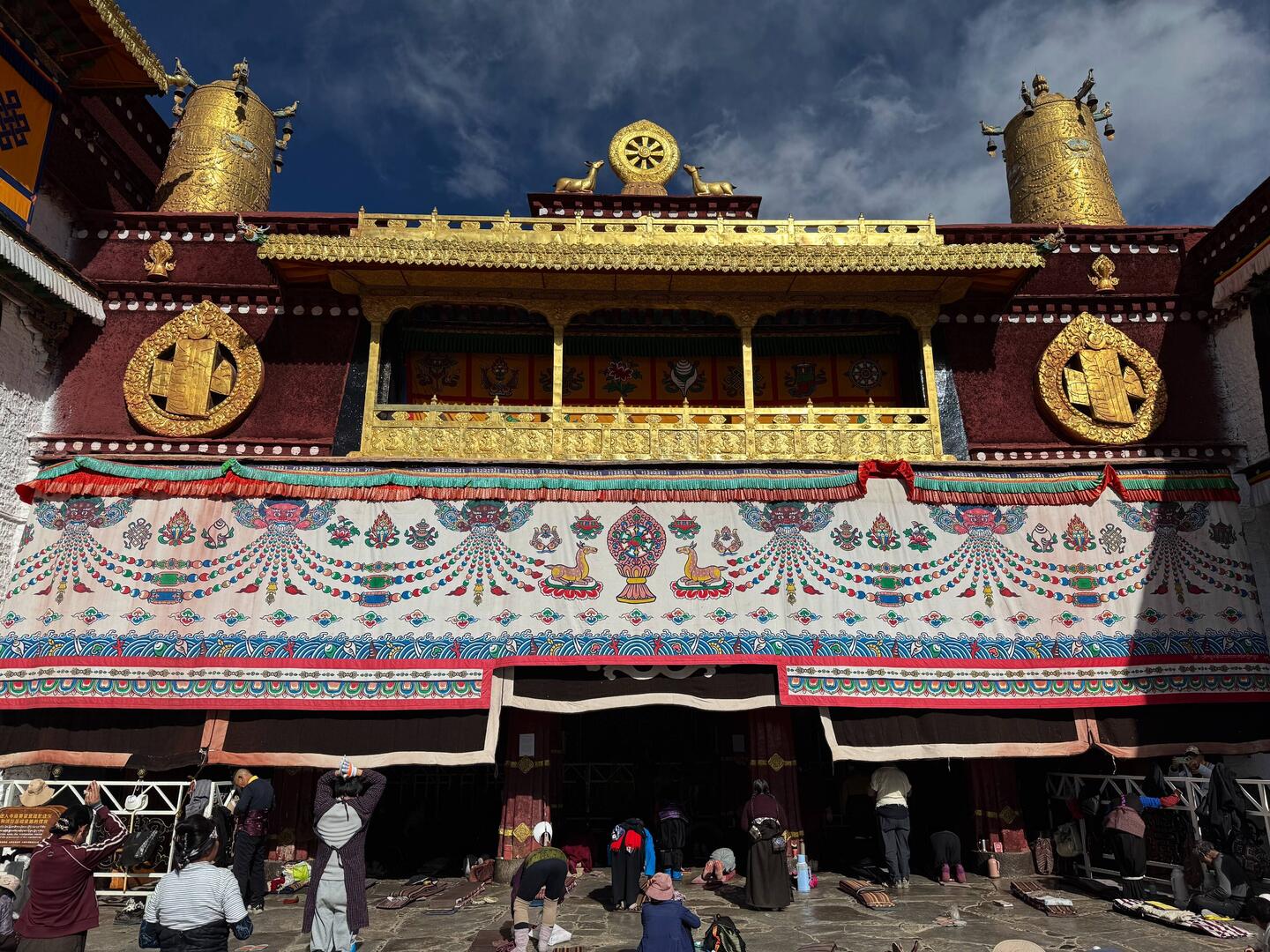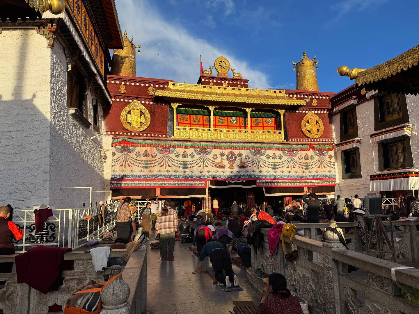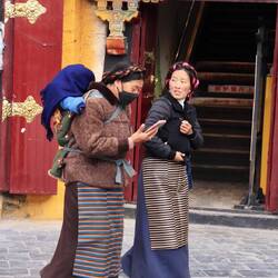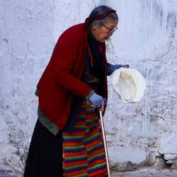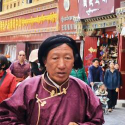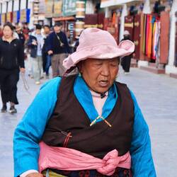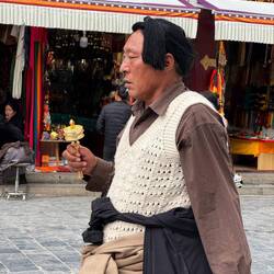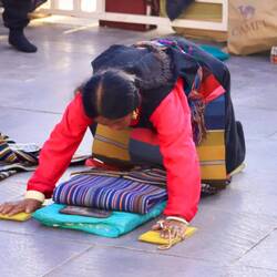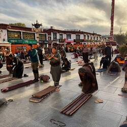 Der Jokhang Tempel wird von einem Wandelgang mit Gebetsmühlen umgeben. Der mittlere Pilgerweg Barkhor verläuft rund um das Kloster. Das Geräusch von Holz, das auf Steinplatten schlägt und reibt, schallt uns entgegen. Es kommt von den Gläubigen, die sich vor dem Tempel der Länge nach flach auf den Boden werfen. Wir erleben hier den allerletzten Abschnitt der langen Pilgerreise kurz vor der Ankunft am Tempel.