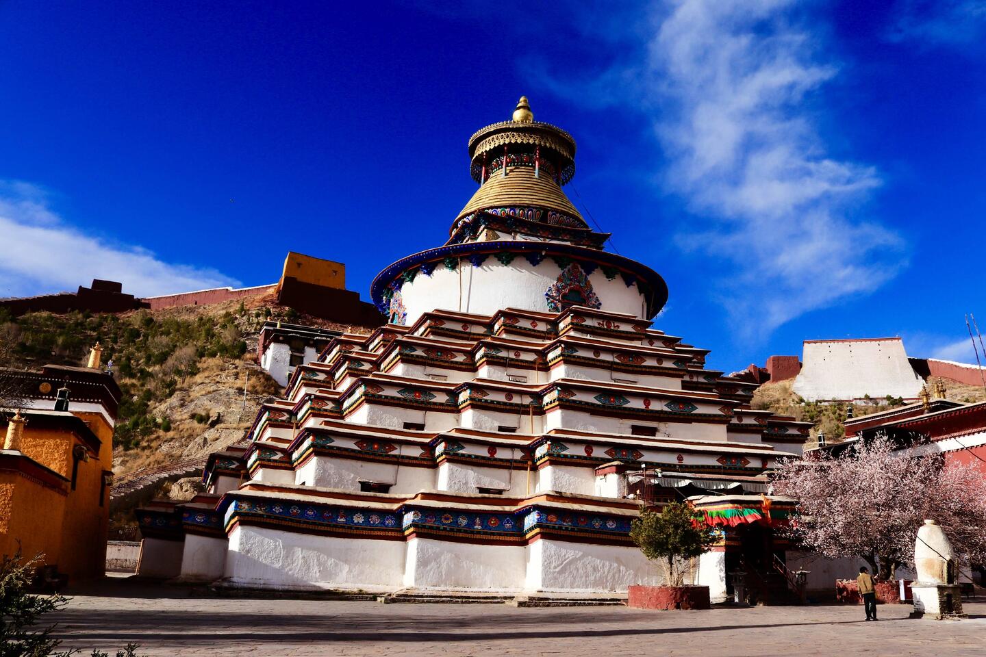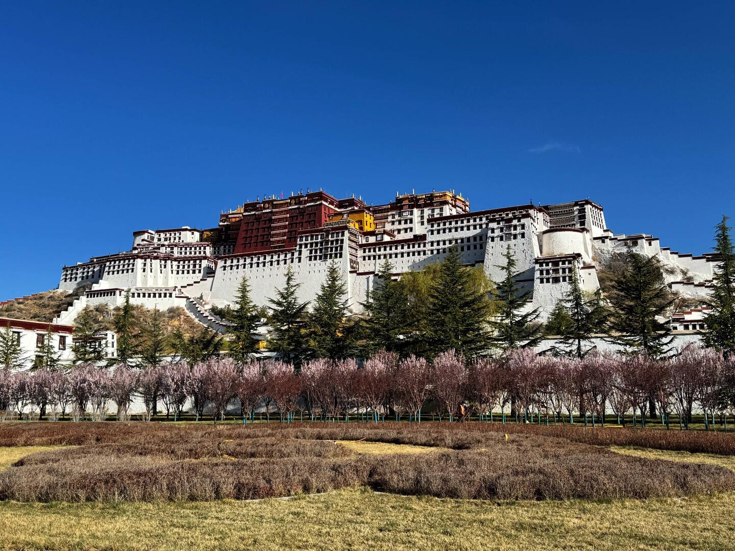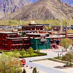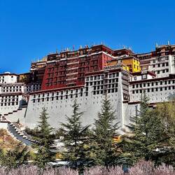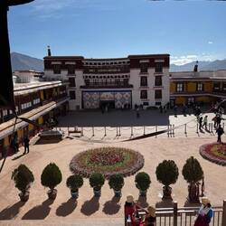 Vielzahl schnell müssen wir diesen wundervollen Ort verlassen. Doch zunächst besteigen wir noch einen Aussichtspunkt, von dem man einen sehr schönen Blick auf den Palast hat. Da das Gebäude an sich schon umwerfend ist, nehmen wir uns hier nochmals viel Zeit. Wir umrunden den Potala Palast und laufen somit den längsten Pilgerweg. Das dumpfe Murmeln der Betenden, das Quietschen der Gebetsmühlen und das leise Klappern der Gebetsketten begleiten uns auf unserem Weg. Es herrscht eine ruhige, meditative Stimmung. Leider drängen sich verkleidete Touristen, die fotografiert werden, immer wieder zwischen die Pilger, die an den Gebetsmühlen entlanglaufen. Da fehlen mir die Worte. Nach unserer Umrundung auf dem Pilgerweg, sehen wir uns den Palast nochmals von der anderen Seite in einem Park an. Die Stimmung ist wunderschön. Die Kirsche. Blühen in voller Pracht. Es ist Samstag und viele Tibeter treffen sich im Park. Musik erklingt und junge wie alte Menschen beginnen spontan zu tanzen uralte Tänze, die bis heute bestehen und auch von der jungen Generation getanzt werden. Das freut. Ich ungemein.Read more