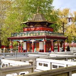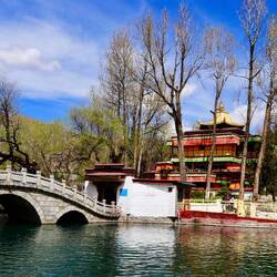 Die Architektur ist völlig anders als die, die wir in Tibet die letzten Tage gesehen haben. Die Tempel liegen in einem herrlichen Park, teilweise umgeben von Seen. Die Statuen im Inneren sind jedoch im Vergleich zu Tibet sehr einfach und grob gestaltet. Das ist sehr enttäuschend. Wir sehen uns daher den Tempel von Außen an und freuen uns an der wunderschönen Lage im Park.