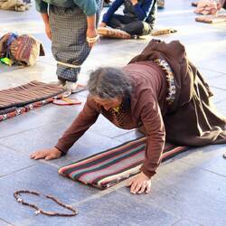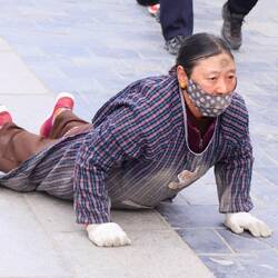 Der Glaube verschafft dem Menschen hier keine sprichwörtlichen Flügel, sondern unvorstellbare Energie für eine der ungewöhnlichsten Fortbewegungsformen. Die Pilger legen Distanzen von 2.000km - in Worten: zweitausend Kilometer. Das muss man sich mal auf der Zunge zergehen lassen - bäuchlings zurück, um in Lhasa im Jokhang-Tempel der Buddha-Statue zu huldigen. Eine lange Schürze, Knieschoner und Holzkeile an Händen und Füßen sind der einzige Schutz vor den unmenschlichen Strapazen, die die Pilger tragen. Wie sieht die Fortbewegung aus? Die Pilger legen sich mit dem Bauch auf den blanken Asphalt, neigen die bloße Stirn auf den Boden und machen mit den Armen eine dem Brustschwimmen ähnliche Bewegung. Dann stehen sie wieder auf, machen 4 Schritte und gehen erneut zu Boden. Dabei knallt das Holz auf den Asphalt und reibt auf den Steinplatten. Auf diese Weise legen sie am Tag etwa 7km zurück. Pilger, die solche Distanzen zurücklegen, werden von einer Person zu Fuß begleitet, die einen Handkarren zieht, auf dem sich die nötigste Ausrüstung befindet.