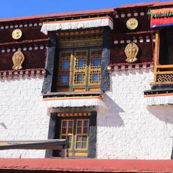 Spektakulär sind die Blicke aus den kleinen Fenstern der Frontpartie auf die tief unten gelegene Silhouette Lhasas. In der obersten Etage betreten wir die Privatgemächer und den Thron der früheren und des amtierenden 14. Dalai Lamas. Wir sind jetzt am höchsten Heiligtum des tibetischen Buddhismus angekommen. Die letzten Schritte führen hinauf aufs Dach des Potala in die gleißende Höhensonne, die steil über der Stadt steht. Von hier oben sehen wir die sich langsam voran bewegenden Menschenketten, wie sie in ritueller Handlung unter dem Drehen ihrer Gebetsmühlen die drei imaginären Kreise durch die Stadt verfolgen. Der erste kleine Kreis führt um den Jokhang-Tempel im Zentrum von Lhasa. Nachdem man diesen Weg mehrmals abgeschritten ist, bewegt man sich auf den 2., schon weitläufigeren Ring, bevor man dann den 3. Ring begeht, der vorbei am Potala-Palast in einer großen Schleife durch die Stadt führt.