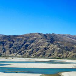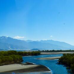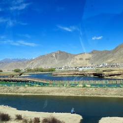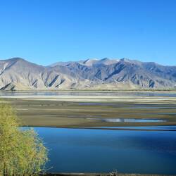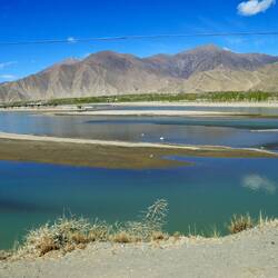 Es ist noch dunkel, aber ich erkenne, dass der Himmel absolut klar ist. Wir starten zeitig, da wir heute viele Kilometer hinter uns bringen müssen. Wir fahren entlang des Brahmaputra Flusses. Der Fluss fließt türkisfarben in einem endlos breiten Flussbett. Viel Sand ist angespült worden. Teilweise türmt er sich zu einer riesigen Dünenlandschft und wir meinen in der Wüste zu sein. Entlang des Flussbetts werden überall Bäume angepflanzt. Das Baumprojekt ist eines der größten Projekte in China. Im gesamten Land wird gepflanzt, um die Emissionswerte zu senken. So auch hier. Da es aber kaum regnet, muss ständig bewässert werden. Millionen Bäume. Die Erosion muss auch dringend gestoppt werden. So werden zwei Fliegen mit einer Klappe geschlagen.