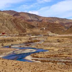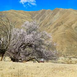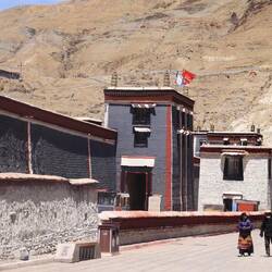 Überall blühen die Kirschbäume und die Felder werden bestellt. Teilweise mit der Hacke, mit dem Pferd und mit kleinen, motorisierten Handpflügen. Für Traktoren sind die Felder zu klein. Die typisch tibetischen Häuser sind zweistöckig. An jeder Ecke auf den flachen Dächern befindet sich ein kleiner Turm, auf dem die Gebetsfahnen flattern. Yakdung mit Stroh vermischt wird zu Fladen geformt und an die Hauswände und Mauern zum Trocken geklebt. Im Winter wird damit gekocht und geheizt.