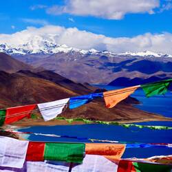 Der Pass führt uns zum Yamdrok-Tso See. Wir haben einen spektakulären Panoramablick auf den herrlichen, skorpionsförmigen, türkisfarbenen, heiligen See. Er liegt in 4440m Höhe über dem Meeresspiegel, hat eine Fläche von 640 Quadratkilometern und ist der größte Süßwassersee Tibets. Sein Name bedeutet „grüner Jadesee der oberen Alm“, was wegen seiner türkisen Farbe sehr zutreffend ist. Hinter dem See erhebt sich majestätisch der schneebedeckte Gipfel des Ningjin Kangsha (7206m). Leider versteckt er sich hinter den Wolken, die langsam zunehmen. Wir sind gerade noch rechtzeitig gekommen, um das Schauspiel aus Licht und Schatten, hellgrünem und dunkelgrünem Wasser zu erleben. Es ist grandios.