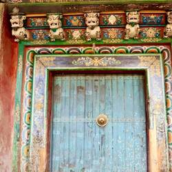 Gyantse war früher ein wichtiger Handelsposten auf der Route zwischen Indien, Bhutan, Tibet und China. Als wir in den Ort fahren, erhebt sich die mächtige Festung über uns auf einem hohen Berg. Sie überblickt die Stadt und ihre Umgebung wie ein Wächter. Durch schmale Gassen, vorbei an Kühen, die vor den Häusern angebunden sind, laufen wir in den alten Teil der Stadt zum Kloster Pelkhor Chode. Es ist bereits früher Abend.