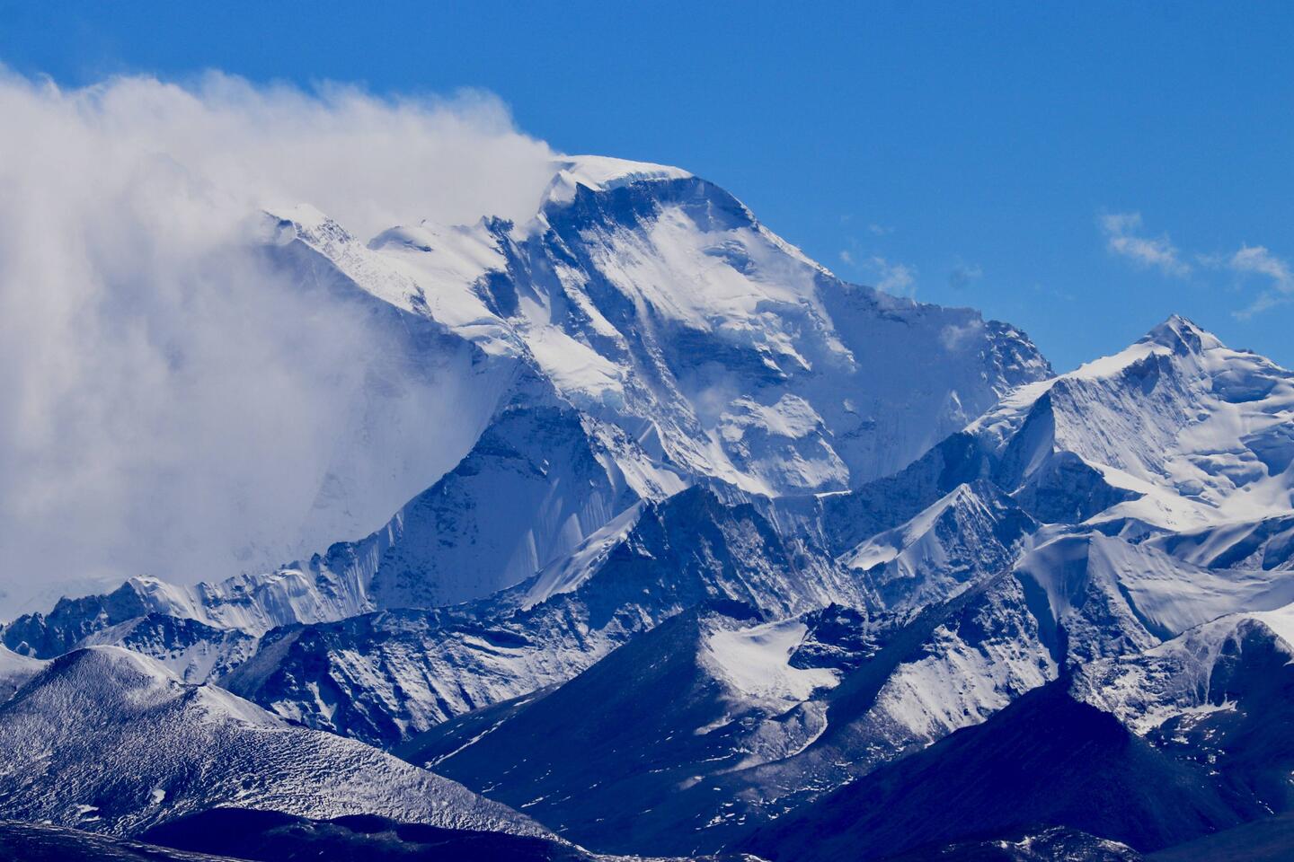 Hier ist also der Ort, an dem sich elf weltklasse Gipfel gegenüberstehen. Der einzige Aussichtspunkt, von dem man fünf Achttausender gleichzeitig sehen kann. Daher wird dieser Ort auch als „schönste Aussichtsplattform der Welt“ bezeichnet. Der Anblick des Berges versetzt einen in eine erhabene, fast spirituelle Stimmung. Hier zu stehen, winzig klein, in der Eiseskälte, mühsam atmend und auf diese weißen Riesen zu blicken, ist ein völlig anderes Gefühl, als gemütlich im warmen Flugzeug an ihnen entlang zu fliegen. Obwohl wir schon weit oben sind und der Qomolongma „nur“ noch 3000m höher liegt als wir hier stehen, spüren wir diese unglaubliche Größe, die Erhabenheit und Kraft der Berge. Es lässt sich nicht mit Worten beschreiben. Aufgrund unserer Position wirken andere Berge viel höher als der Qomolangma. Von Osten schiebt sich blauer Himmel über die Berge. Sie glitzern in der Sonne. Ich kann mich kaum sattsehen, obwohl ich so schwer atmen muss. Im Auto freue ich mich sehr überdies Sitzheizung und die automatische Sauerstoffzufuhr. Eiskalte, dünne Luft macht es der Lunge so schwer ausreichend Sauerstoff zu erhalten. Allerdings hilft der eisige Wind und erleichtert das Atmen eher.
