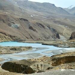 Wir fahren die steil abfallende Passstraße hinunter und folgen den Serpentinen mit ihren scharfen Kehren, während die vielen 6.000-er-Gipfel um uns herum wegen der sich dynamisch verändernden Perspektive scheinbar rasterhaft höher werden und sich nach jeder Kurve mit einer anderen Silhouette präsentieren. Vorbei an Schluchten und rauschenden, kristallklaren Bächen, in denen Yaks trinken, nachdem sie zuvor regungslos mitten auf der Straße gestanden haben und die Autos sich einen Weg um sie herum suchen mussten. Ich liebe diese kargen Weiten, auf denen nichts zu wachsen scheint, in denen ab und an eine Herde Yaks steht und immer mal wieder tibetische Gebetsfahnen im Wind flattern. Eine erhabene Stimmung macht sich in mir breit. Eine tiefe Ruhe. Überraschend sammelt sich das Schmelzwasser aus den Gebirgsbächen zu einem riesigen Fluss. Nein, kein Fluss. Es ist ein Stausee. Leuchtend grün glitzert er in der Sonne zwischen den riesigen Bergen. Ein toller Anblick, obwohl der Mensch hier doch massiv in die Natur eingegriffen hat.