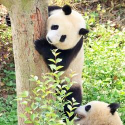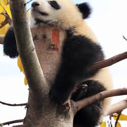 So beobachten wir die riesigen Pandas, die genüsslich ihren Bambus fressen, immer wieder ein wenig wegdösen und es sogar schaffen auf den Baum zu klettern. Danach ist man aber so erschöpft, dass man in der Baumkrone erst mal ein Nickerchen machen muss. Die Pandas sind schon äußerst gemütliche Zeitgenossen. Ihre Augen sind meist halb geschlossen und sie wirken wie kleine Knöpfe auf den riesigen Köpfen.