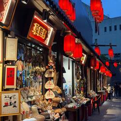 Nach unserer Einkaufsodyssee bummeln wir ein letztes Mal durch die Gassen. Besonders schön ist es am Abend, wenn die Laternen leuchten. Ein kurzer Regenschauer sorgt dafür, dass viele die Flucht ergreifen und so wird es sogar ein wenig leerer und auch leiser. Eine sehr stimmungsvolle Straße.