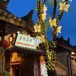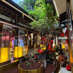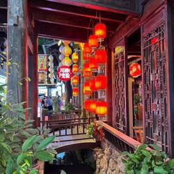 Neben dem Kloster schließt sich eine wunderschöne kleine Fußgängerzone in typisch chinesischer Architektur mit schönen Cafés, Restaurants und Geschäften an. Wir sind begeistert und bummeln kreuz und quer durch die Gassen.