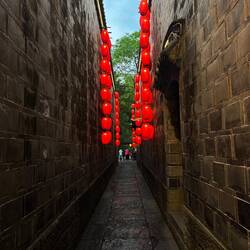Die Kuan-Zhai Gasse ist ein historisches Viertel im Zentrum von Chengdu, das für seine Architektur aus der Qing-Dynastie und seine lebendige Straßenkultur bekannt ist. Hier erlebt man Chengdus antikes Flair und sein kulturelles Wesen. Beim Schlendern über das Kopfsteinpflaster spürt man die dichte historische Atmosphäre. Es gibt hier mehr als 20 alte Hofhäuser und kunstvoll verzierte Tore zu bewundern, wie zum Beispiel „Kai Lu“, eines der repräsentativsten Tore der Kuan-Zhai-Gasse. Jede Ecke strahlt nostalgischen Charme aus. Der Sichuan-Baustil mit seinen schlichten Häusern und kunstvollen Schnitzereien, die alle eine genauere Betrachtung wert sind, begeistert uns. An jeder Ecke entdecke ich neue Fotomotive.