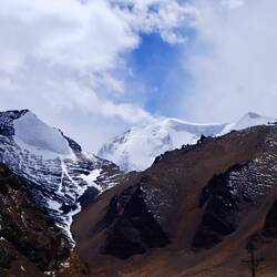 Der Karo-La Pass ist ein Hochpass in der Lhagoi-Kangri-Kette des nördlichen Himalaya. Der Anstieg verläuft vom Yamdrok Tso entlang des Tals Kalurong zum Berg Noijin Kangsang (7206m). Er ist einer der vier größten, schneebedeckten Berge in Tibet. In seinen Schluchten gibt es über 100 Gletscher. So auch den wunderschönen Gletscher Karo-La auf 5560m Höhe. Er besteht aus einer Eiskappe mit langsamem Gefälle und zwei hängenden Gletscherzungen, die 3 bzw. 4,5km lang sind. Er erstreckt sich vom Himmel mit einer Wolke und Nebelschwaden bis zur Straße und gleicht einem großen gefrorenen Fall, der sich darauf vorbereitet, vom hohen Gipfel herunterzufließen. Der obere Teil des Gletschers erscheint in der Sonne hell, glitzernd und durchscheinend und ähnelt einem großen Thangka, der an der Klippe hängt. Das Karo-La Massiv und ist von mehr als zehn weiteren Gipfeln über 6000 Metern umgeben. Im Kontrast zum blauen Himmel, den weichen Wolken und den farbenfrohen Gebetsfahnen ist die Landschaft des Karo-La Gletschers absolut beeindruckend. Wir warten lange auf die blauen Löcher im Himmel, um dann zu erkennen, dass sich immer im letzten Moment, bevor sie über dem Gletscher stehen, Wolken von unten in das blaue Loch schieben. Ein Phänomen, das leider jeden Mittag zu beobachten ist. Dennoch finden wir einige blaue Löcher und sind begeistert, wie die Sonne in die Gletscherspalten scheint und Eiswasserfälle zum Glitzern bringt. Die Formen der Gletscher sind unglaublich, Glatte erscheinende Flächen, hängende Zungen, ein wildes Durcheinander an Spalten und Löchern. Höhlen, mit gefrorenen Wasserfällen. Davor erhebt sich eine StuPa umgeben von bunten Gebetsfahnen, die im Wind flattern. Für uns ein unglaubliches Naturspektakel. Wir haben noch nie eine Gletscherlandschaft erlebt und sind begeistert. Dabei bemerke ich überhaupt nicht, wie kalt es eigentlich ist. Er ist im Auto wird klar, wie durchgefroren ich bin. Da werde ich die nächsten Tage auf mich aufpassen müssen.