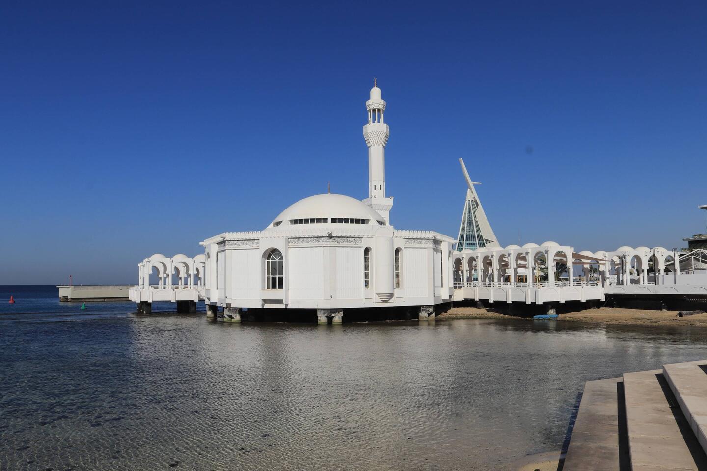 Die Al Rahmah Mosque ist eine der auffälligsten und wichtigsten Moscheen der Stadt. Die weiße Moschee wurde in den 80-er Jahren am Roten Meer gebaut. Das Bauwerk mit vielen hellen Bögen steht auf Pfeilern im Wasser. Bei Flut scheint die Moschee zu schwimmen. Beim Sonnenuntergang ist die Al Rahmah Moschee ein besonders schöner Anblick.