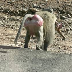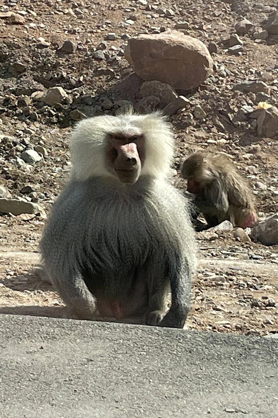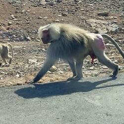 Zunächst fahren wir durch flaches Wüstenland, bis sich einige Berge erheben. Leider sind wir in der 3-spurigen Autobahn gefangen und es gibt keine Möglichkeiten anzuhalten. Es braucht definitiv kleinere Straßen, um die Landschaft genießen zu können. Unsere Begleiter sind Kamele, Esel und Paviane. Weihrauchbäume wachsen in den Tälern und Wadis. Ein paar Schnappschüsse aus dem Fenster müssen reichen.