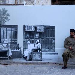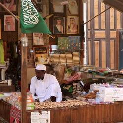 Ich erlebe die Altstadt als lebhaftes Museum. Es macht einfach unglaublich viel Spaß, sich in dem labyrinthartigen Straßennetz auf der Suche nach immer schöneren Häusern zu verlieren. Am frühen Nachmittag ist es noch leer. Erst ab 16 Uhr beginnt das echte Leben. Die kleinen Geschäfte mit ihren dunklen Holztüren werden geöffnet. Kunden gibt es zu Hauf. Es ist weniger ein Tourimarkt, sondern ein Suq für die Bevölkerung. Stoffe und Teppiche werden verkauft. Über Geschmack lässt sich streiten. Wir entdecken wunderschöne Häuser und sind froh, gerade jetzt hier zu sein. Es ist noch nicht zu spät und wir entdecken noch viele völlig unrestaurierte Gebäude. Viele Straßenzüge sind komplett eingerüstet. Ich hoffe sehr, dass die renovierten Häuser nicht zu einheitlich aussehen und ihre Seele verlieren. Überall wird geklopft und gehämmert. Dennoch sitzt die Bevölkerung in den Hasueingängen und trinkt Kaffee. Plötzlich sitzt Moritz auch dort und hält das dampfende Getränk in der Hand. Im Gegensatz zur Corniche sind die Menschen sehr offen, freundlich und neugierig und es ergeben sich einige nette Gespräche. Jeddah strahlt eine unglaubliche Atmosphäre aus und ist ganz sicher ein Juwel, was Altstädte angeht. Ein Traumort. Als wir auf einer Dachterrasse zu Abend essen und auf das Minarett blicken, erklingt der Ruf des Muezzin, der über die gesamte Stadt schallt. Eine unglaubliche Stimmung. Kurz darauf bummeln wir durch erleuchtete Straßen. Ich erinnere mich plötzlich an ein Weihnachtsbilderbuch aus Kindertagen. Die Häuser sahen so aus wie hier. Und mit einem Mal ist mir weihnachtlicher Zumute, als in den ganzen letzten Adventswochen zusammen. Ein sehr schöner Moment.