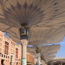 Um den Pilgern im Außenbereich der Moschee Schutz vor der erbarmungslosen Sonne zu bieten, wurden überdimensionale Sonnenschirme aufgebaut. Jeder dieser Schirme wiegt 45 Tonnen, ist 15 m hoch und kann aufgespannt 625 m² Schatten spenden – genug für jeweils 800 Pilger! Dank eingebauter Lüfter lässt es sich hier bei bis zu 50° aushalten. Insgesamt gibt es 250 dieser Sonnenschirme, sodass eine Schattenfläche von 160.000 m² entsteht. Die Schirme werden zur Mittagshitze aufgespannt und Abends wieder eingefahren. Das ganze passiert dank einer Computersteuerung binnen unglaublicher 15 Minuten. Das Projekt wurde durch die Firma Liebherr realisiert.