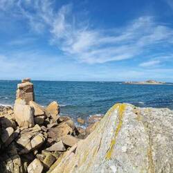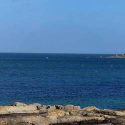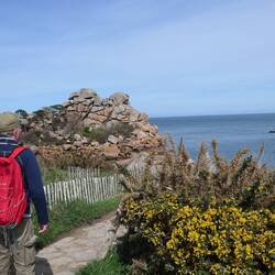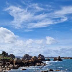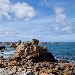 Nur wenige Kilometer weiter südwestlich an der Cote de Granit Rose: grandiose Ausblicke aufs Meer, viele Variationen von blau und abenteuerliche Felsformationen.